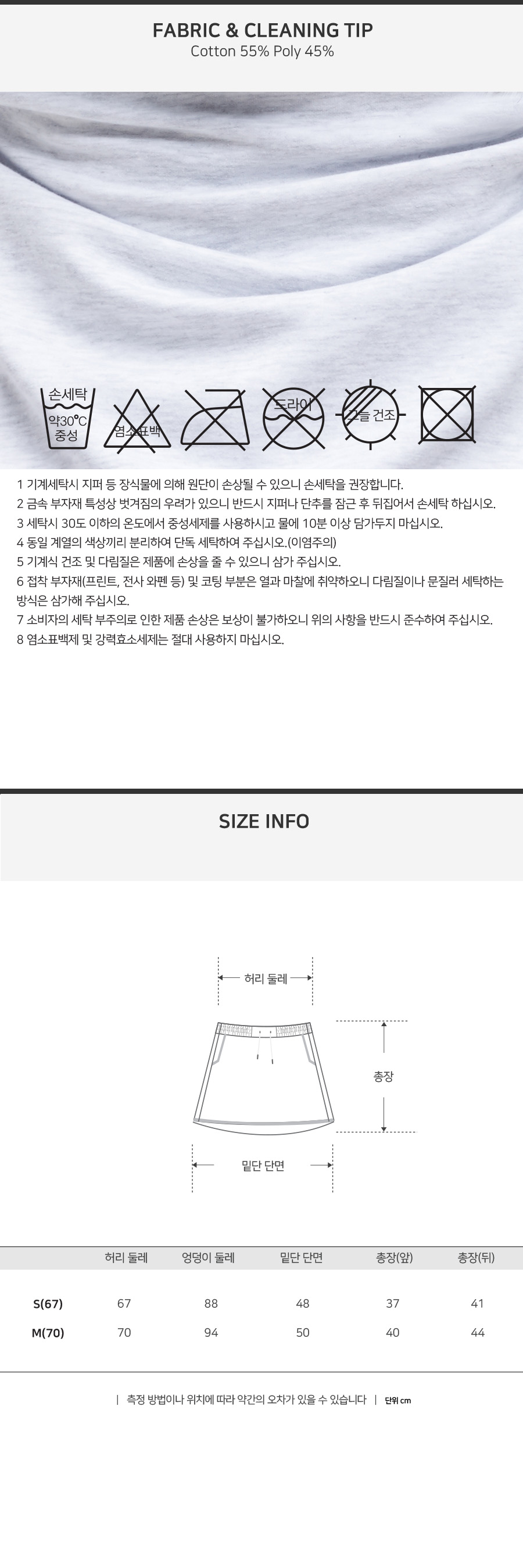 | 세탁방법 및 취급시 주의사항 | 1 기계세탁시 지퍼 등 장식물에 의해 원단이 손상될 수 있으니 손세탁을 권장합니다. 2 금속 부자재 특성상 벗겨짐의 우려가 있으니 반드시 지퍼나 단추를 잠근 후 뒤집어서 손세탁 하십시오. 3 세탁시 30도 이하의 온도에서 중성세제를 사용하시고 물에 10분 이상 담가두지 마십시오. 4 동일 계열의 색상끼리 분리하여 단독 세탁하여 주십시오.(이염주의) 5 기계식 건조 및 다림질은 제품에 손상을 줄 수 있으니 삼가 주십시오. 6 접착 부자재(프린트, 전사 와펜 등) 및 코팅 부분은 열과 마찰에 취약하오니 다림질이나 문질러 세탁하는 방식은 삼가해 주십시오. 7 소비자의 세탁 부주의로 인한 제품 손상은 보상이 불가하오니 위의 사항을 반드시 준수하여 주십시오. 8 염소표백제 및 강력효소세제는 절대 사용하지 마십시오. |